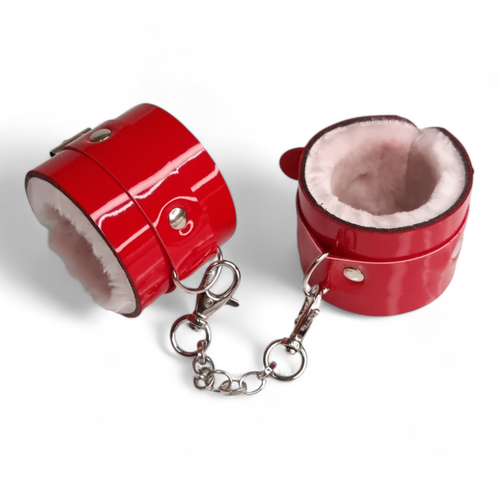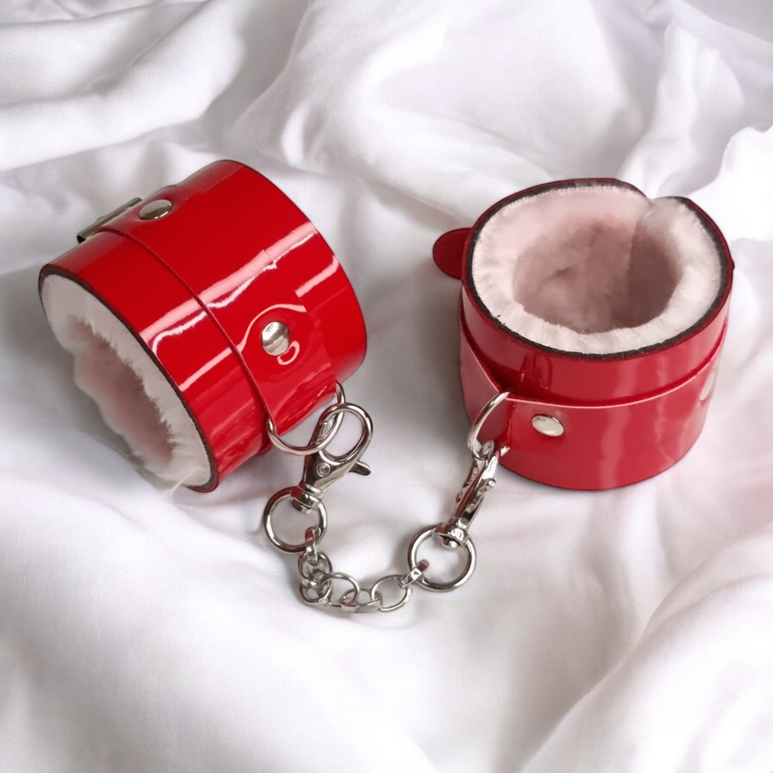 Спробуйте закувати вашу другу половинку у надійні лакові наручники. Незамінна річ для любителів жорстких еротичних ігор! Надійно прив'язавши вашу видобуток ви сміливо зможете катувати її всіма різними і доступними для вас способами. Кожен аксесуар виготовлений з еко-шкіри тонкого вироблення неймовірного червоного відтінку з хутром і прикрашений металевими аксесуарами срібла. Тримайте партнера повністю зафіксованим у цих кайданках! Ці манжети, з'єднані швидкороз'ємним затискачем, можна прикріпити до інших ременів безпеки або будь-якого обладнання, яке у вас є. Міцні, але гладкі, з м'яким хутром усередині. Головне вміти вчасно зупинитися і не переступити межу дозволеного і розпусного світу сексу та кохання!!