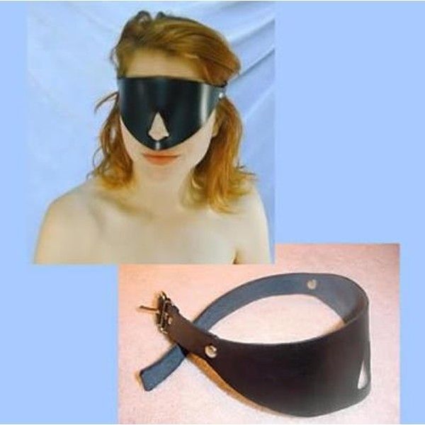 Шкіряна чорна маска без отворів на очах. Трикутний виріз для носа. Ззаду регульований ремінець.