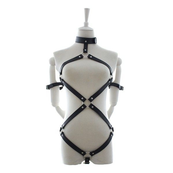 Чорний бондаж виготовлений з натуральної шкіри у формі ромба. Сковує шию, талію і руки за спиною. Регульовані ремені.