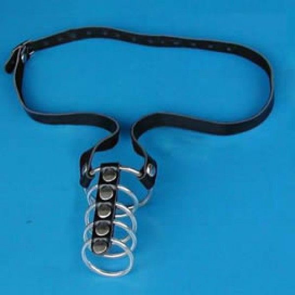 Шкіряний чорний фіксатор на пеніс з п'ятьма металевими кільцями для БДСМ