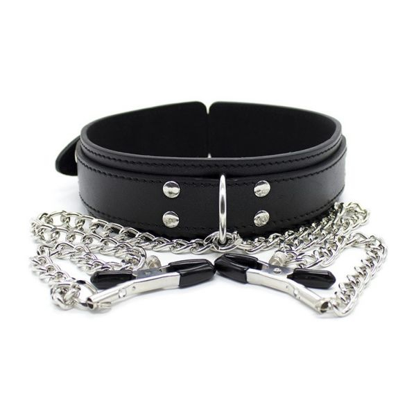 Шкіряний чорний нашийника з зажимами для сосків Unisex