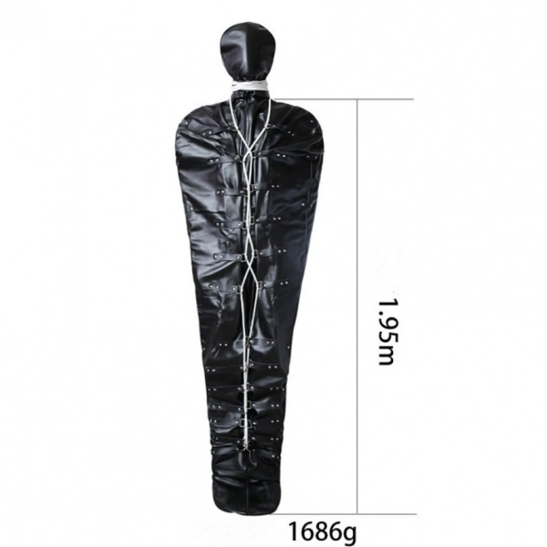 Надзвичайно простий в застосуванні і зручний комплект дозволить вам без особливого клопоту зафіксувати "жертву" в потрібному положенні. Цей мішок для тіла виготовлений з високоякісної чорної шкірозамінника екошкіри. Шкіряний мішок для муміфікації туго закривається шнурками.У комплекті є капюшон, який знімається.Це бондажний мішок підходити для людини зростом до 194 см.