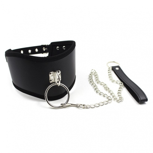 Шкіряний нашийник з металевим ланцюгом зроблений з міцної, гнучкої шкіри чорного кольору. Також нашийник має D-кільце до якого прикріплюється ланцюг. Такий аксесуар по достоїнству оцінять любителі БДСМ-ігор.