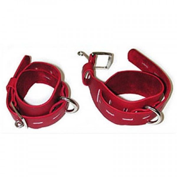 Манжети червоного кольору, виготовлені з екошкіри ширина 5 см.вони можуть бути використані у вигляді наручником, манжетів на щиколотки і нашийника. Діаметр регулюється в межах 14-52 см.є металеве кільце для додаткових цілей.