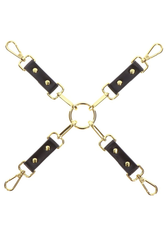 Хрестоподібний фіксатор для бондажу з карабінами та кільцем та золотистою фурнітурою чорного кольору Taboom Hogtie