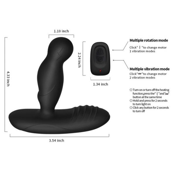 For incredible orgasms with targeted P-spot and perineum pleasure, Ancus delivers intense vibrations to your external pleasure points. Controlled either by remote or the button on the toy, this massager allows you to flick through the 16 vibration patterns, 3 rotating shaft speeds and even heating function to explore with ease for unparalleled pleasure.PRODUCT DETAILSMaterial: Silicone, ABSSize: 90*110*Ø28mmFunction:16 vibration +3 rotation modesFeature: Prostate, anus and perineum stimulator100% Waterproof, Phthalate freeBattery: Li-battery, USB ChargeCharging & Using time: 2h/1hPACKAGING INCLUDE1 x Prostate Massager1 x Remote Controller1 x User Manual1 x USB cable1 x Storage bag