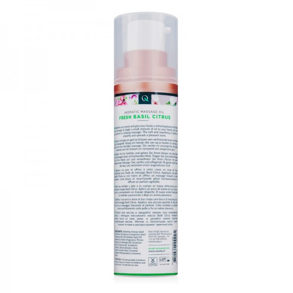 Насолоджуйтесь розслаблюючим ефектом масажу Exotiq. Це масажне масло має прекрасний цитрусовий аромат базиліка. Використовуйте дозатор, щоб нанести трохи олії на руки, потріть руки, щоб нагріти олію, а потім нанесіть її на тіло вашого партнера. Масажне масло має шовковисту м'якість і поживний ефект.
