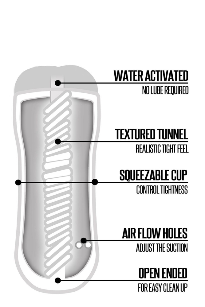 Мастило для душу не потрібно. Використовуйте погладжувач окремо або в чашці, що стискається для мастурбації. Вузький тунель здається таким реальним і має подвійні отвори для повітря, що регулюють всмоктування. Дуже довгий шнур для душу. Легко очищуваний рукав з відкритим кінцем. Безпечний для тіла і не містить фталатів.