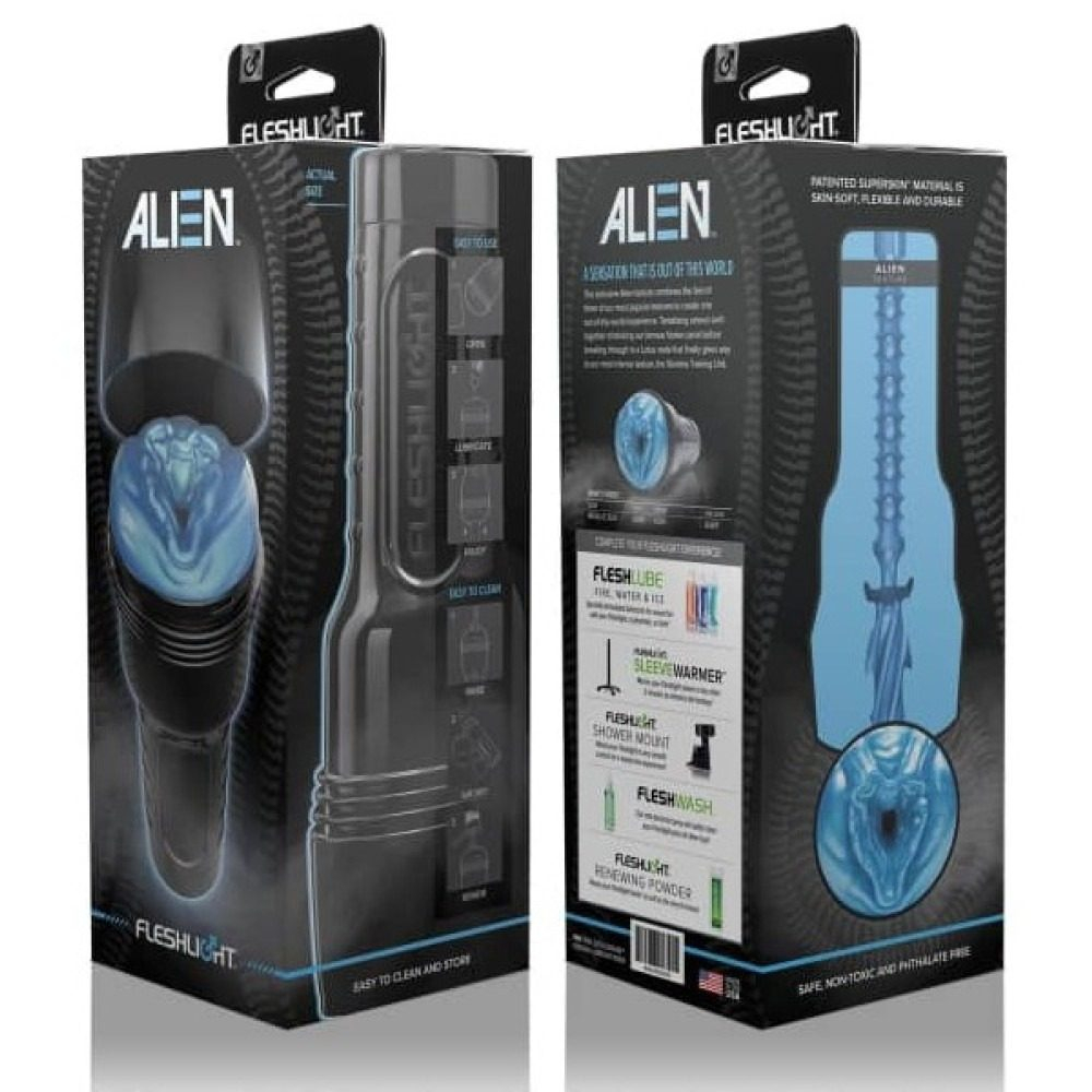 Зовнішній вигляд мастурбатора Fleshlight Alien по-справжньому космічний – він має перламутровий блакитний колір та структуру, схожу на піхву жінки, яка мешкає на Землі, але з двома кліторами.