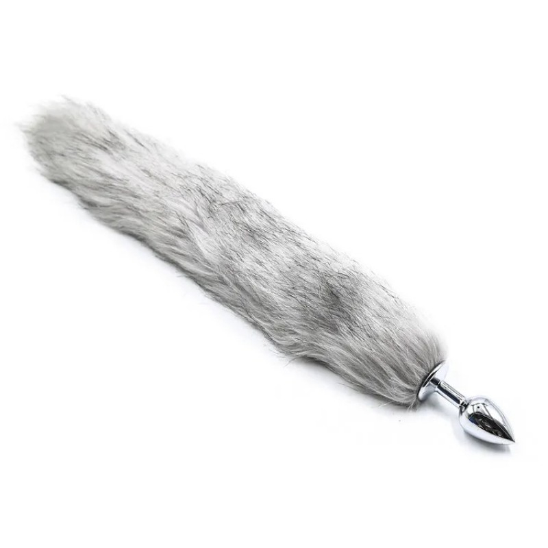 Металлическая анальная пробка с длинным серым хвостом