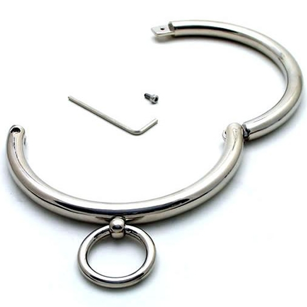 Нашийник раба з нержавіючої сталі ручної роботи. Полірований, можна носити в якості прикраси. Привабливий і досить комфортний нашийник. З металевим кільцем спереду для ланцюга або повідця. Внутрішній діаметр 12 см., Товщина стержня 1,1 см.