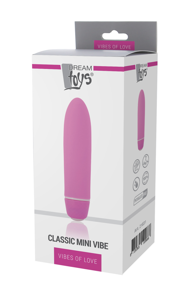 Цей міні-вібратор має гладкий стрижень та форму торпеди. Він простий у використанні, тому що всіма 7 різними функціями можна керувати за допомогою однієї кнопки внизу. Він пропонує 3 пульсуючі ритми, 1 наростаючий ритм і 3 вібраційних ритми. Classic Mini Vibe захищений від бризок та легко миється. Для цього потрібні 2 батареї АА, які не входять до комплекту. Довжина цього вібратора 101 см, а ширина 25 см.