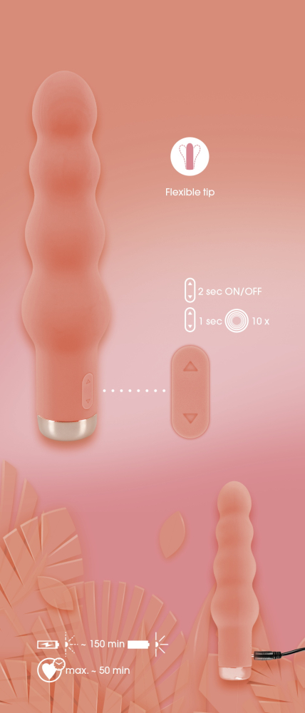 Потужна дитина для роботи на ходу! Пастельний красивий міні-вібратор з намистин від Peachy! в стимулюючому, тонкому конічному кулястому дизайні - поміститься в будь-яку кишеню! 10 режимів вібрації забезпечують різноманітне задоволення при вагінальних та анальних іграх, а також при стимуляції зовнішніх точок задоволення, та зручно регулюються вгору та вниз одним натисканням кнопки. Високоякісний силіконовий матеріал з м'якою на дотик текстурою забезпечує дуже приємні відчуття на шкірі під час гри та пустощі. Перезаряджається - USB-кабель для заряджання входить у комплект. Загальна довжина 16,5 см, довжина вставки 13 см, Ø 2,3 см – 4 см. Вага 133 г. Силікон, поліуретан, ABS.