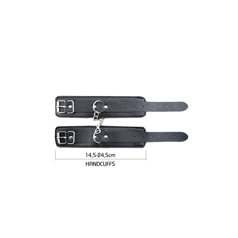 Наручники на ланцюжку з карабіном. М'які широкі наручники зі шкірозамінника, які регулюються за обсягом-відмінний спосіб фіксації! Між собою з'єднані знімною ланцюжком. Фіксуйте руки між собою, на ліжку або в будь-якому іншому відповідному місці! Ширина наручників 5 см, Довжина регулюється від 14,5 до 24,5 см.