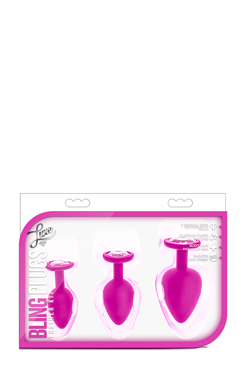 Набір анальних пробок LUXE BLING PLUGS TRAINING KIT PINK-в цей комплект входить три пробки різних розмірів. Кожна пробка має конічний наконечник для легкого введення. Починаючи з маленького розміру для початківців, ви можете поступово перейти до середнього, а потім до великого, коли Вам буде комфортно. Використовуйте цей комплект, якщо ви і Ваш партнер новачок в анальної грі або просто використовуйте це на додаток до своєї звичайної еротичної грі. Для досягнення найкращих результатів використовуйте мастило на водній основі.