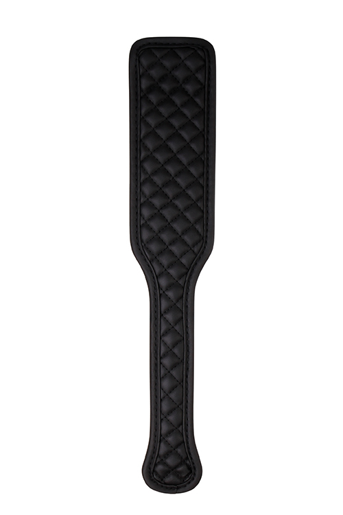 Манжети, комір, пов'язка на очі та лопатка з м'якої веганської шкіри з ромбоподібним простроченням.