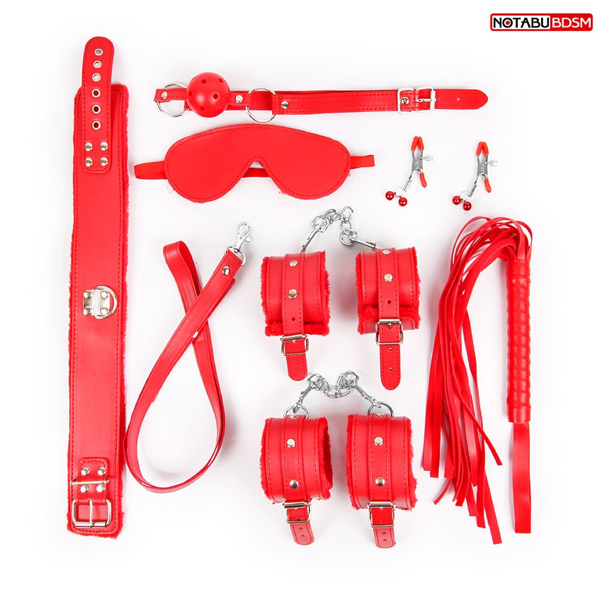 Чудовий набір аксесуарів для любителів БДСМ. У комплект входять кляп, наручники, кайдани, нашийник, повідець, мотузка, маска, батіг, затискачі для сосків.