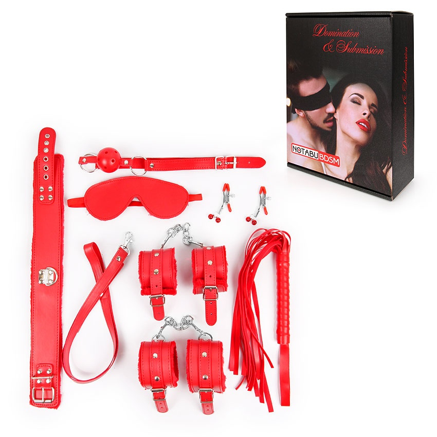 набір для БДСМ ігор червоний (маска, кляп, затискачі, батіг, нашийник, повідець, наручники, кайдани)