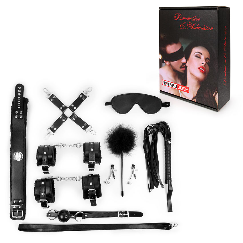 Набір для БДСМ-ігор Notabu маска,кляп,затискачі,батіг, нашийник,наручники,кайдани,лоскоталка, фіксатор Колір Чорний