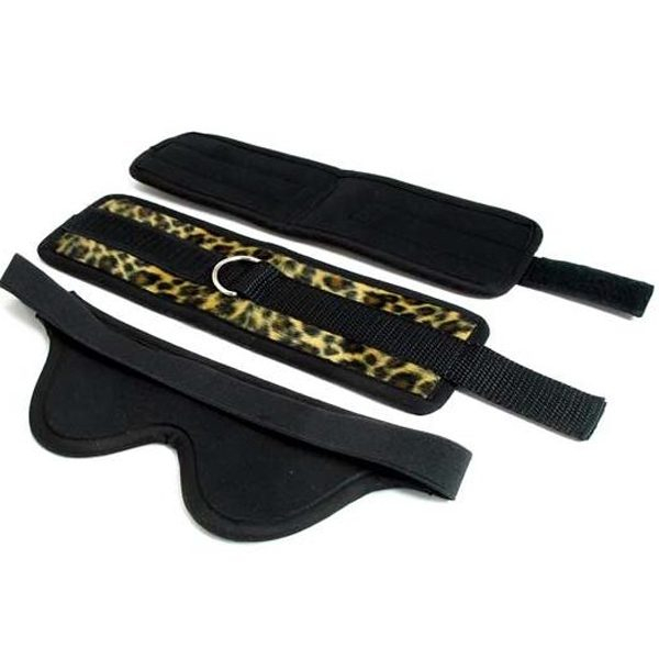 Набір фіксаторів включає в себе обмежувачі для рук або ніг, а також пов'язку на очі. Виготовлений з високоякісного м'якого матеріалу, леопардова драпірування. Цей набір можна використовувати як вдома, так і на природі. Пов'язка на очі і манжети закріплюються за допомогою застібок-липучок. Ширина наручників / наножників 7,3 см, діаметр регулюється в межах 12,5-30,4 см.