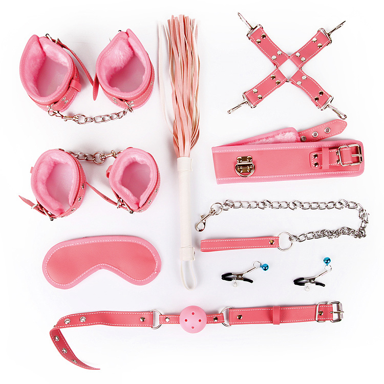 Чудовий набір аксесуарів для любителів БДСМ. У комплект входять наручники, кайдани, нашийник з повідцем, мотузка, фіксатор, батіг, кляп, маска, затискачі для сосків.