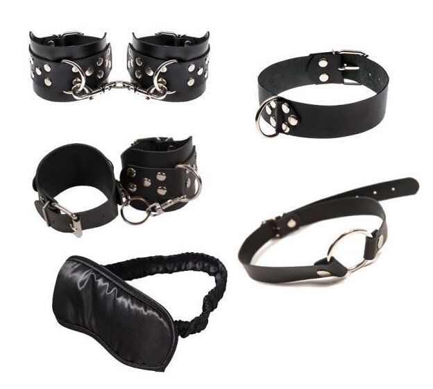 У комплекті шкіряні кляп, наручники, кайдани, нашийник, повідець, чотирнадцяти хвоста батіг, хрестовий фіксатор, сатинова маска і вервка для зв'язування.