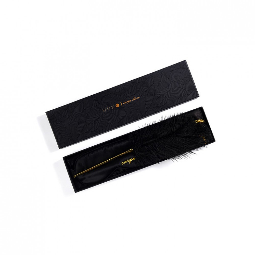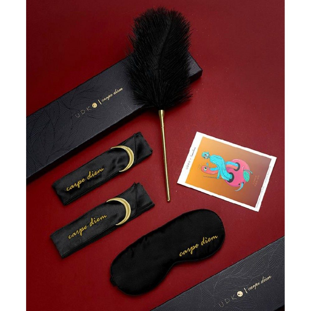 Дивовижний набір, який допоможе вам провести романтичний вечір та запам'ятати його на довго. Carpe Diem-красиві слова латинською позначають «лови момент». Так чому б не наслідувати пораду і не віддатися яскравим відчуттям під час ніжних та інтригуючих сексуальних ігор саме сьогодні! Шикарний набір для закоханих складається з: Маски для очей око приховає погляд вашого партнера і створить для нього атмосферу солодкої інтриги.Коли людина позбавляється одного органу чуття - інші загострюються у багато разів, це абсолютно нове задоволення.Маска утримується на голові за допомогою еластичної гумки.Розміри маски: 12.5 см*8.5 см зв'язування М'які сатинові стрічки для зв'язування скують руки вашого партнера, заточуючи його в солодкий полон Тепер ви вільні робити з ним будь-що, і він нікуди не зможе втекти Довжина стрічок: 138 см Ширина: 4,2 см Перо Premium Feather Tickler Прекрасне перо на сталевій паличці - це те, що потрібно! Його можна використовувати спільно з ігровим костюмом хатньої робітниці, під час заняття тантричним сексом або просто для збудження у любовних іграх. В аксесуарі використовуються пір'я страуса, металевий стрижень, покритий позолотою 24к, для зручності транспортування стрижень пера відкручується. Довжина металевої палички: 14 см. Довжина кожного пера: близько 20 см. Весь набір дбайливо упакований у гарну коробочку, що робить його ідеальним для подарунка. Набір також входить сатиновий мішечок для зберігання.