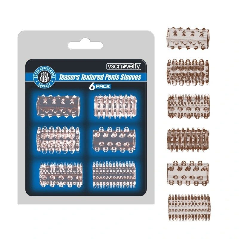 Текстуровані рукави для пеніса Teasers - ідеальний вибір для тих, хто хоче досягти більш твердої та тривалої ерекції, одночасно приносить величезне задоволення своєму партнеру. Збільште свій пеніс, додавши обхват і текстуру, щоб підняти задоволення вашого коханця вгору і допомогти вам протриматися довше. У комплекті 6 рукавів із 6 різними текстурами. Змішайте його з 6 абсолютно різними стилями стимуляції, і ваш партнер буде ворожити до самого першого поштовху. Різні текстури принесуть партнеру додаткове задоволення. Виготовлений з супереластичного ТПЕ, не містить фталатів і латексу. Насадки на пеніс є одними з найпопулярніших інтимних іграшок, що користуються попитом. За допомогою насадок надається можливість не тільки збільшити розмір статевого члена чоловіка, а й доставити додаткове задоволення та стимуляцію своїй партнерці завдяки додатковим вусикам і пухирцям. Також існують насадки з вібрацією, що викликає захоплення обох партнерів і підносить сексуальне життя на новий рівень. Подібні інтимні товари необхідно після кожного використання очищати та дезінфікувати за допомогою антисептичних засобів. Також необхідно правильно зберігати таку продукцію та виймати батареї під час невикористання. Насадки і кільця з вібрацією привносять різноманітність і нові незабутні відчуття в сексуальне життя пар. ковзних / рухливих технологіях і технологіях, що самозмазуються, і прагнемо надавати передові рішення. "від концепції до реальності", щоб допомогти клієнтам створювати кращі та практичні продукти для дорослих. Маючи більш ніж 8-річний досвід та інновації, Vscnovelty створила процеси, інструменти та навчання, що дозволяють швидко реагувати на потреби клієнтів та зміни ринку, при цьому контролюючи витрати та якість наших секс-іграшок.