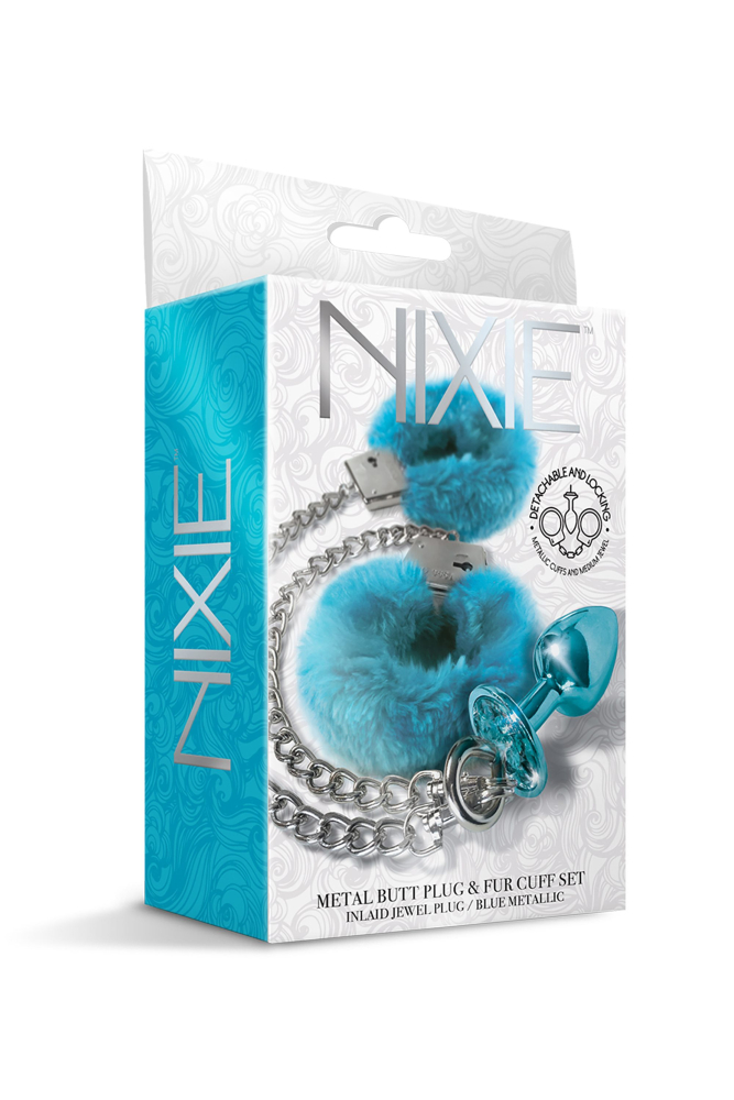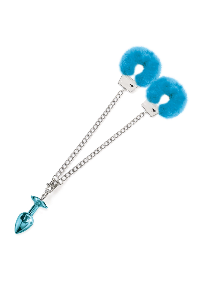 Набір Пані БДСМ Анальна пробка та Наручники зі штучного хутра блакитного кольору NS Novelties Global Novelties Nixie Metal Butt Plug & Furry Handcuff Set Blue Metallic розмір Medium
