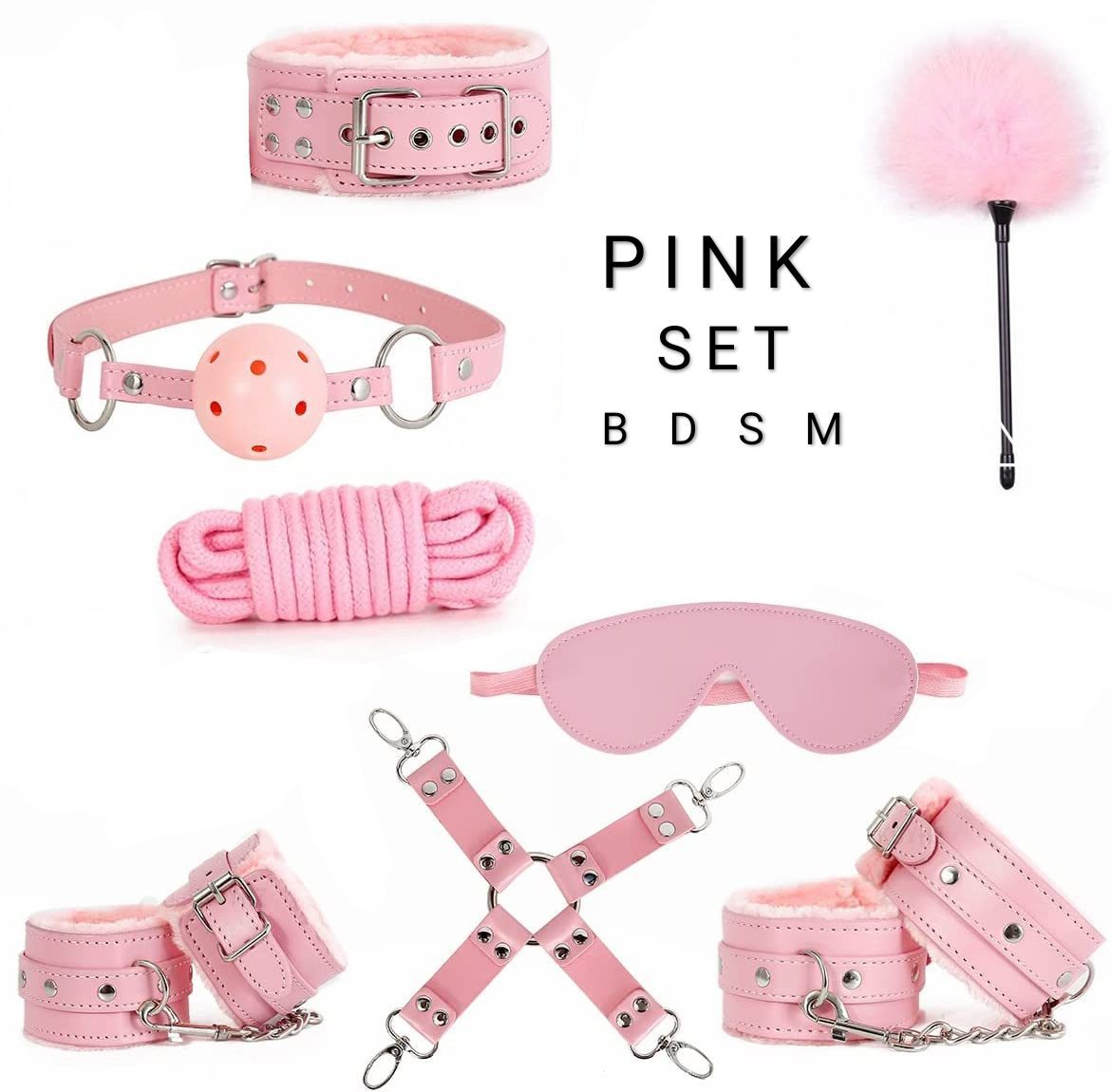 Романтичний вечір з нотками підпорядкування - це коли партнер спочатку ніжно фіксує все тіло для повного знерухомлення, а після - пестить до знемоги. З БДСМ набором «Loving submission» можна фантазувати та використовувати різні техніки знерухомлення: фіксуйте тіло за допомогою кайданів та наручників фіксатором, який з'єднує їх між собою, використовуйте техніку шибарі (зв'язування) або просто вибирайте одну зону тіла, яка цього вечора буде позбавлена можливості рухатися! БДСМ набір «Loving submission» зроблений із приємних на дотик матеріалів. Всі деталі легкі та не завдають дискомфорту під час використання. Наручники та кайдани зроблені з рожевої еко шкіри з металевими застібками, на внутрішній частині м'який плюш. Конектор рожевий, що з'єднує наручники та кайдани виконаний з екошкіри з металевими прищіпками. Маска рожева – еко шкіра, усередині м'який замш. Кляп рожевий - пластикова кулька з дірочками для вільного доступу повітря, ремінець зроблений з еко шкіри з металевою застібкою. Лоскітка-пластикова ручка з рожевими пір'їнками на кінчику. Мотузка рожева 3 метри – м'яка та приємна, не натирає шкіру, не завдає дискомфорту навіть при сильному зв'язуванні. Затискачі на соски - металеві з фіолетовими дзвіночками. Матеріал: еко шкіра, плюш, метал Колір: рожевий