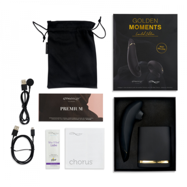У набір Golden Moments входять надзвичайно популярні іграшки Womanizer Premium і We-Vibe Chorus виконані в елегантному і сексуальному чорному кольорі.