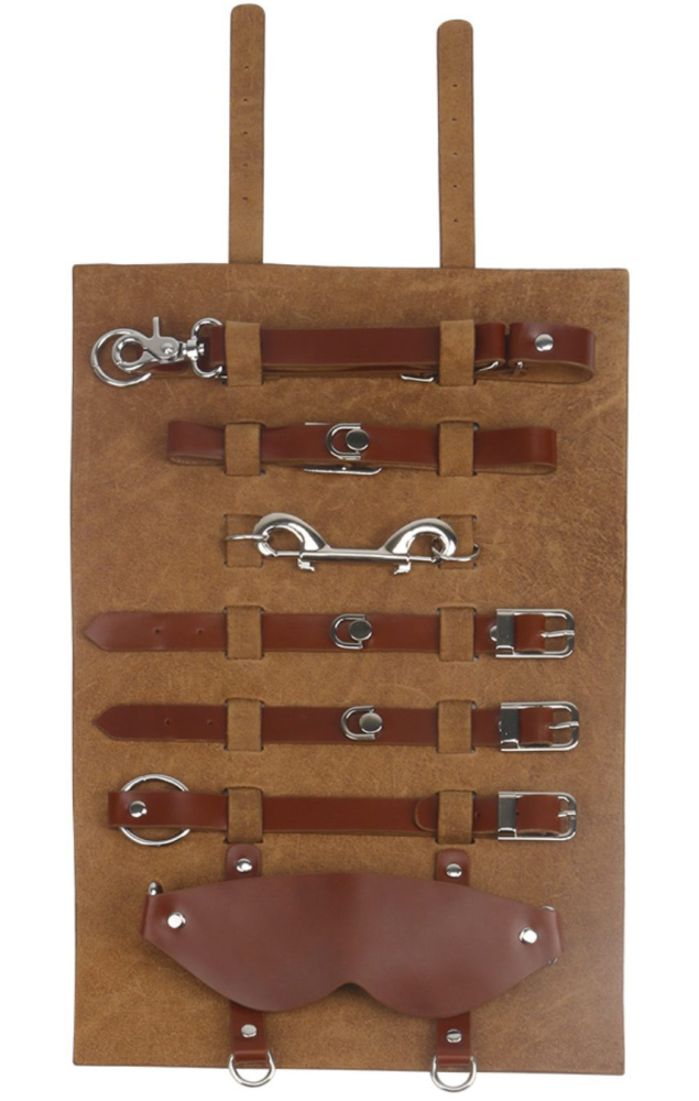 Якісні аксесуари для бондажу прикрасять ваші інтимні моменти та дозволять реалізувати задумані сценарії. Вони забезпечать ідеальну фіксацію та незрівнянні відчуття повної покірності. Пориньте в інтригуючий світ ігор з елементами БДСМ і випробувайте захоплюючі емоції. Набір для бондажу складається із шести елементів і виконаний у благородному коричневому кольорі. Вироби м'які навпомацки і не травмують шкіру. Ремені, нашийник, пов'язка на очі та карабіни дозволять встановити свої правила на сексуальній арені. Задіяйте свою уяву і дерзайте назустріч сміливим експериментам. Розмір аксесуарів регулюється. Набір представлений у зручному чохлі.