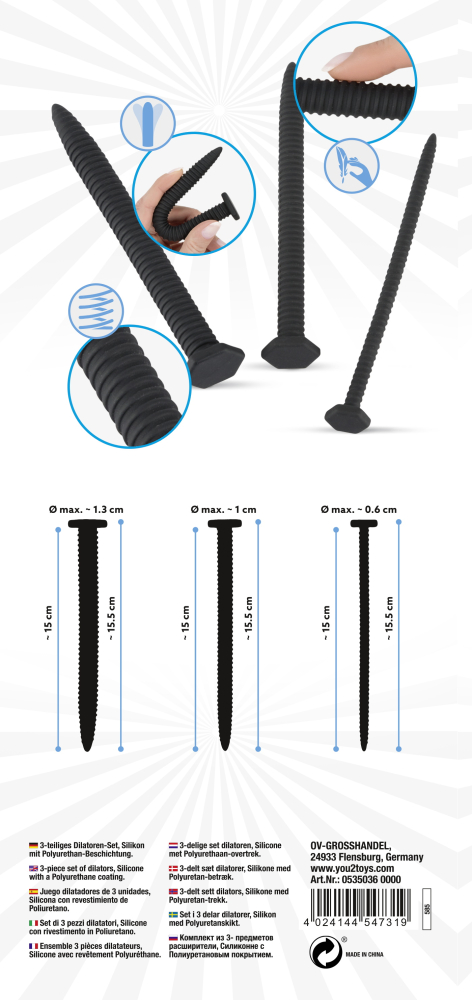 За глибокі почуття в уретрі! 3 дуже довгих розширювача в захоплюючій гвинтовій оптиці та з різними діаметрами та різною вагою. Ідеально підходить для початківців та фахівців з дилатації уретри. Стимулюючі канавки інтенсивно стимулюють уретру, а пробка запобігає надто глибокому проникненню.