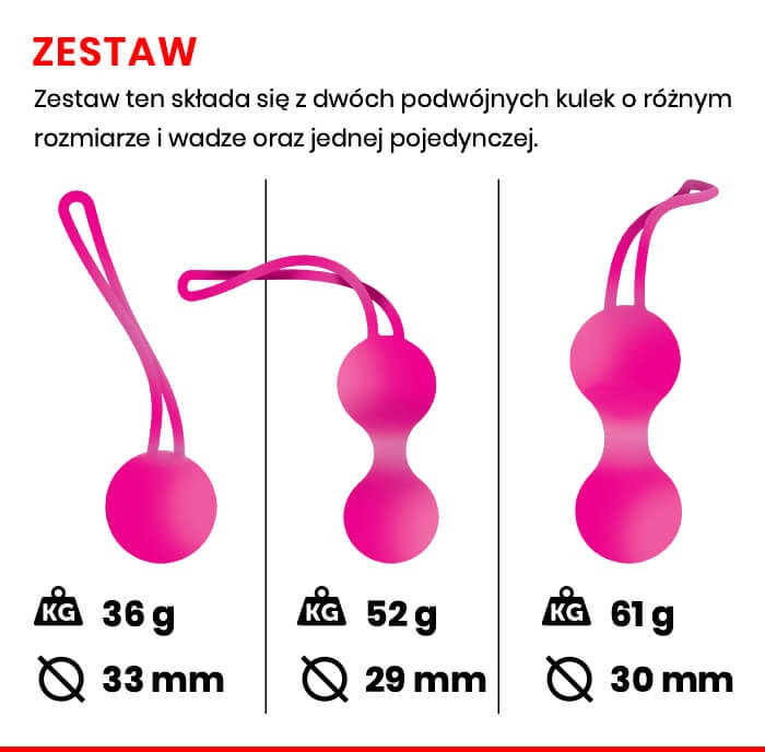 У комплект входять дві подвійні кульки різного розміру і ваги і одинарна кулька.