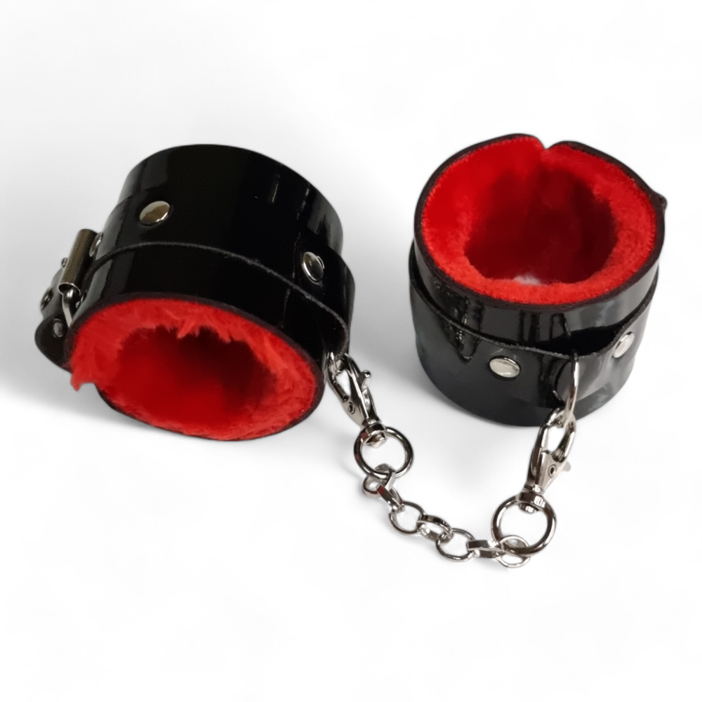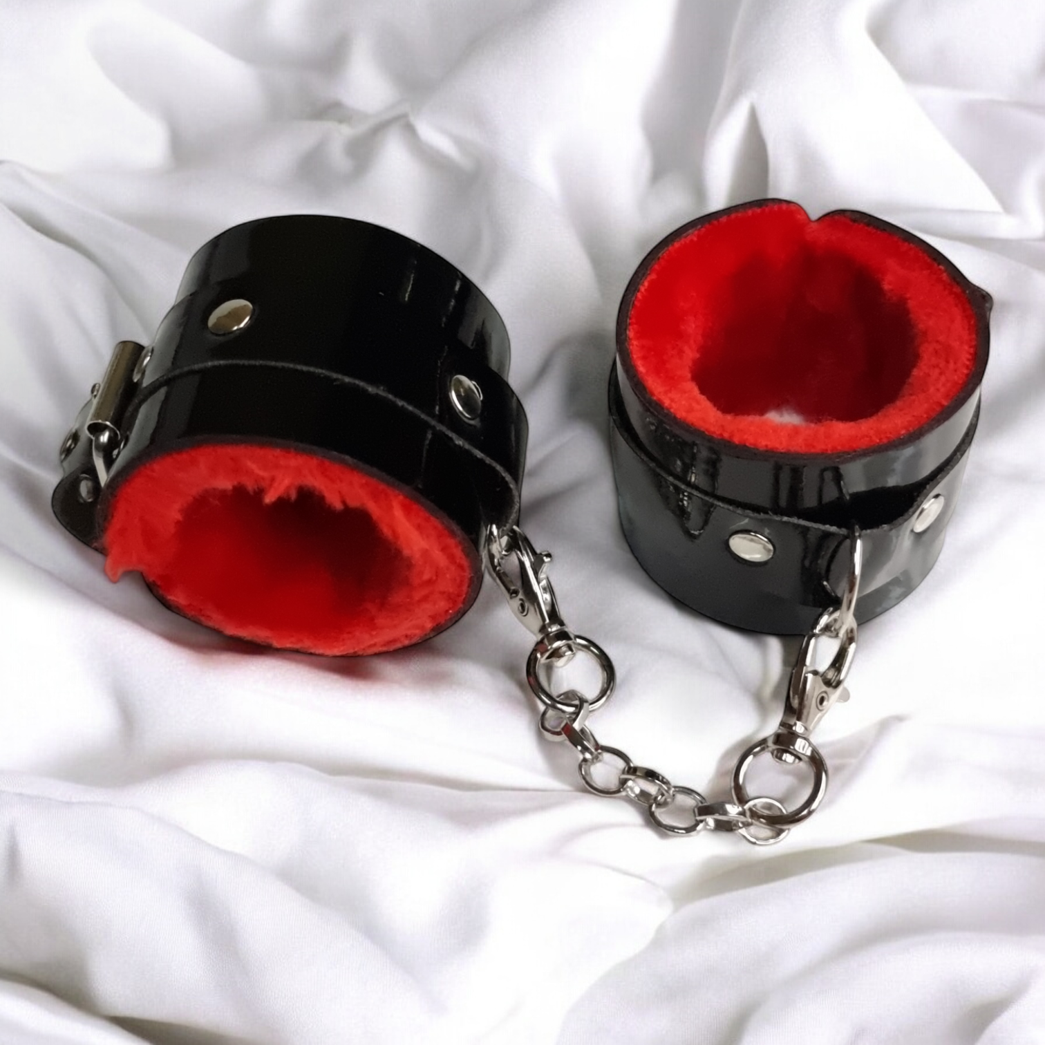 Спробуйте закувати вашу другу половинку у надійні лакові наручники. Незамінна річ для любителів жорстких еротичних ігор! Надійно прив'язавши вашу видобуток ви сміливо зможете катувати її всіма різними і доступними для вас способами. Кожен аксесуар виготовлений з еко-шкіри тонкого вироблення неймовірного червоного відтінку з хутром і прикрашений металевими аксесуарами срібла. Тримайте партнера повністю зафіксованим у цих кайданках! Ці манжети, з'єднані швидкороз'ємним затискачем, можна прикріпити до інших ременів безпеки або будь-якого обладнання, яке у вас є. Міцні, але гладкі, з м'яким хутром усередині. Головне вміти вчасно зупинитися і не переступити межу дозволеного і розпусного світу сексу та кохання!!