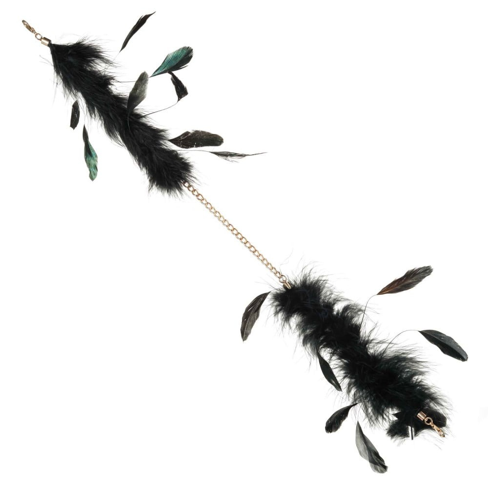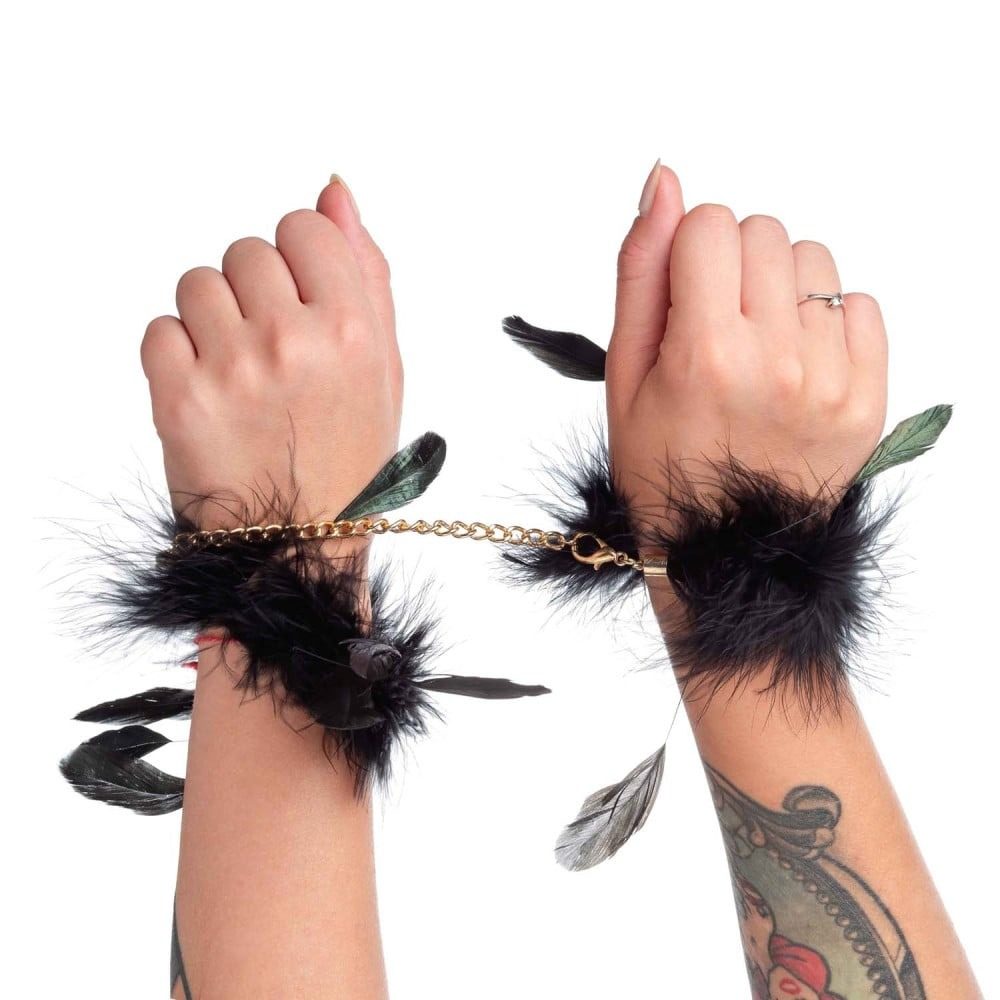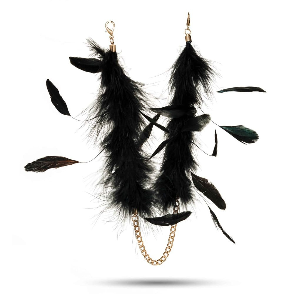 Наручники чорні з довгим пір'ям DS Fetish на золотому ланцюжку
