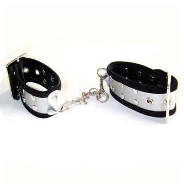 Сучасні чорні наручники з металевими пластинами. Виготовлені з високоякісного матеріалу. Можна прикріпити ланцюг або поводок.