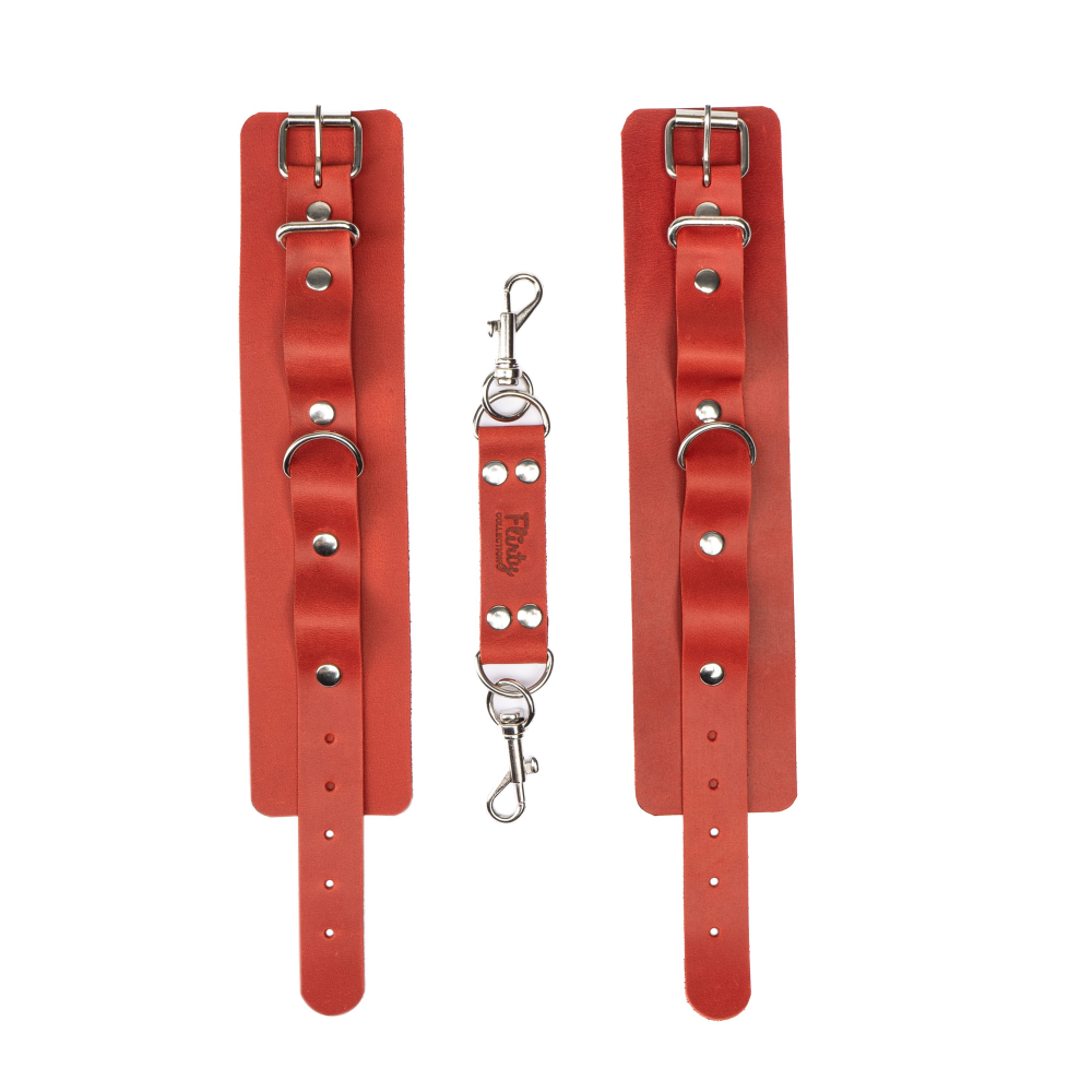 Наручники Flirty виготовлені із якісної, натуральної шкіри. Наручники з'єднуються шкіряним ремінцем на двох карабінах, що легко відстібається, і наручники можна використовувати як браслети. У застебнутому стані щільно прилягають до тіла, а ширина виробів дозволяє використовувати їх без побоювання пошкодити руку або залишити синці. Регулюються в широкому діапазоні, щоб дати можливість затягнути їх тугіше або навпаки трохи послабити. Довжина манжети – 22 см. Ширина манжети – 5 см. Регулюється від 17 см до 23 см.