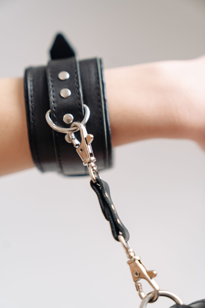 Характеристики Наручники з карабінами БДСМ із натуральної шкіри чорного кольору Scappa
