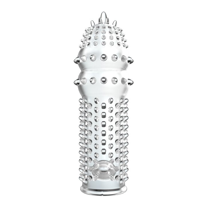 Еластична насадка з шипиками і додатковим стимулятором клітора, з яскраво вираженими пухирцями на поверхні.