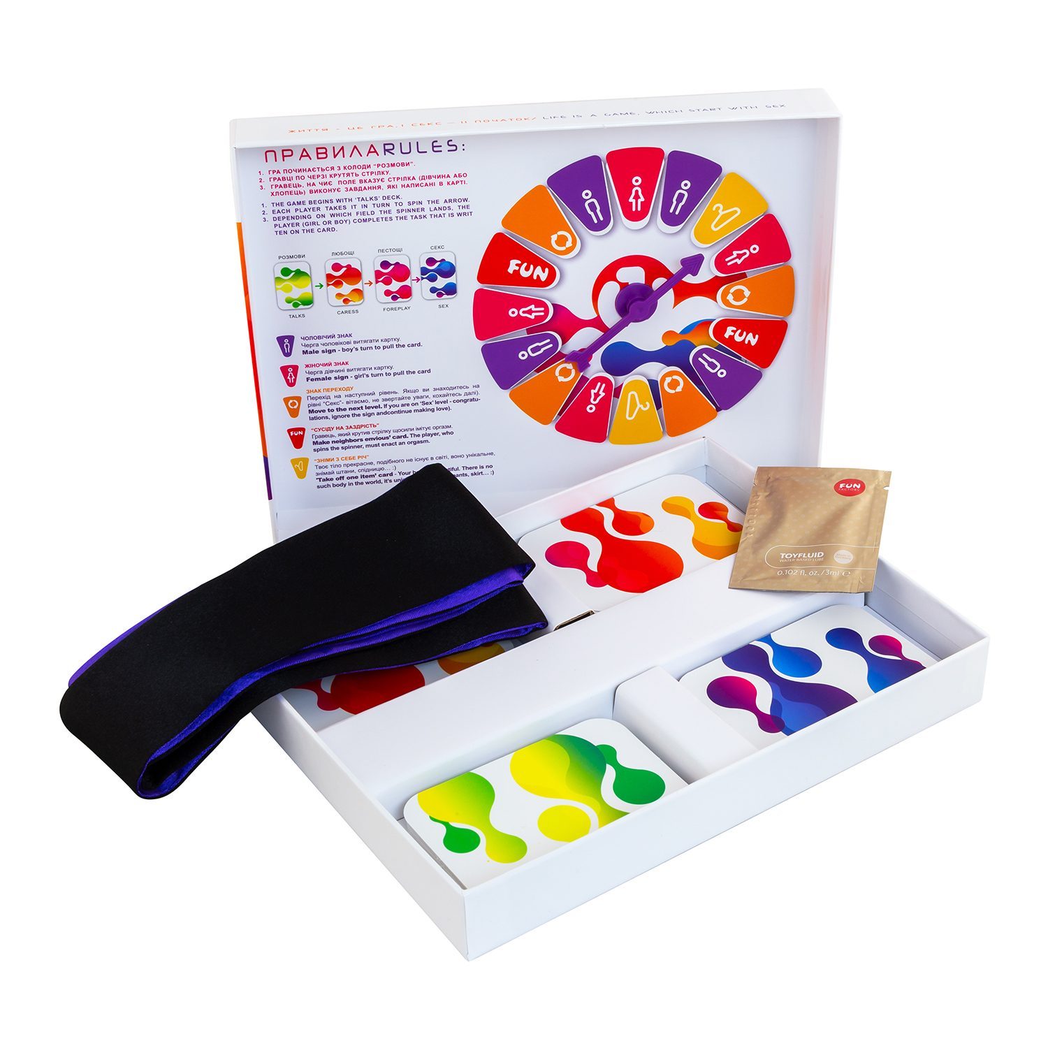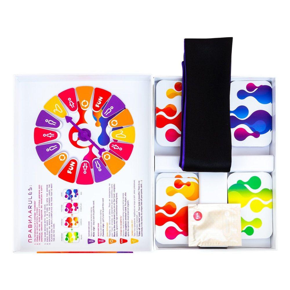 Комплектація: 92 картки з шаленими завданнями, ігрове поле, правила, фірмова пов'язка на очі або для фіксації рук, лубрикант Fun Factory, (Німеччина) 3мл.