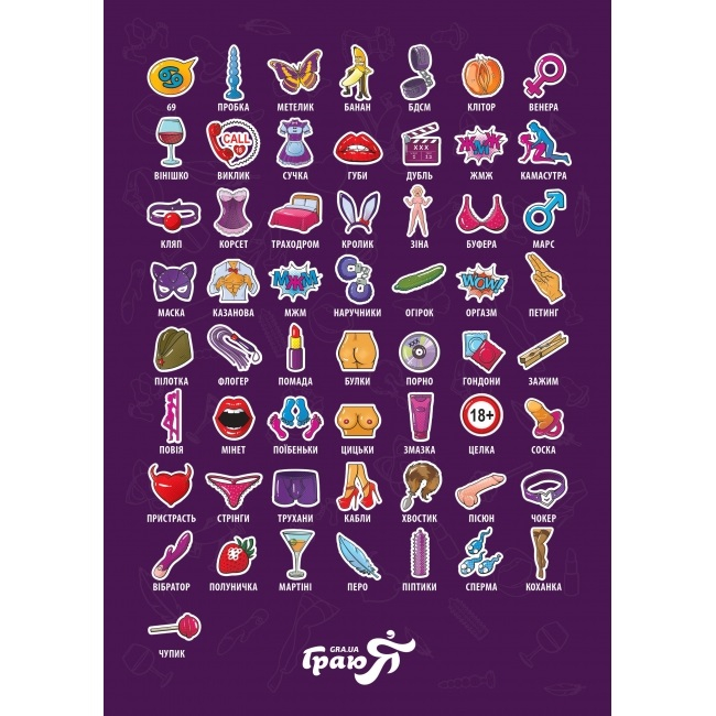 Дизайн карт нічим не гірше упаковки. Кожна картинка в одних викликає збентеження, а в інших - мабуть збудження! Зображення чіткі, яскраві і дуже круті! Гру можна купити в якості сувеніра і подарувати партнеру. Спробуйте подарувати настільну гру другу і перевірте його реакцію!