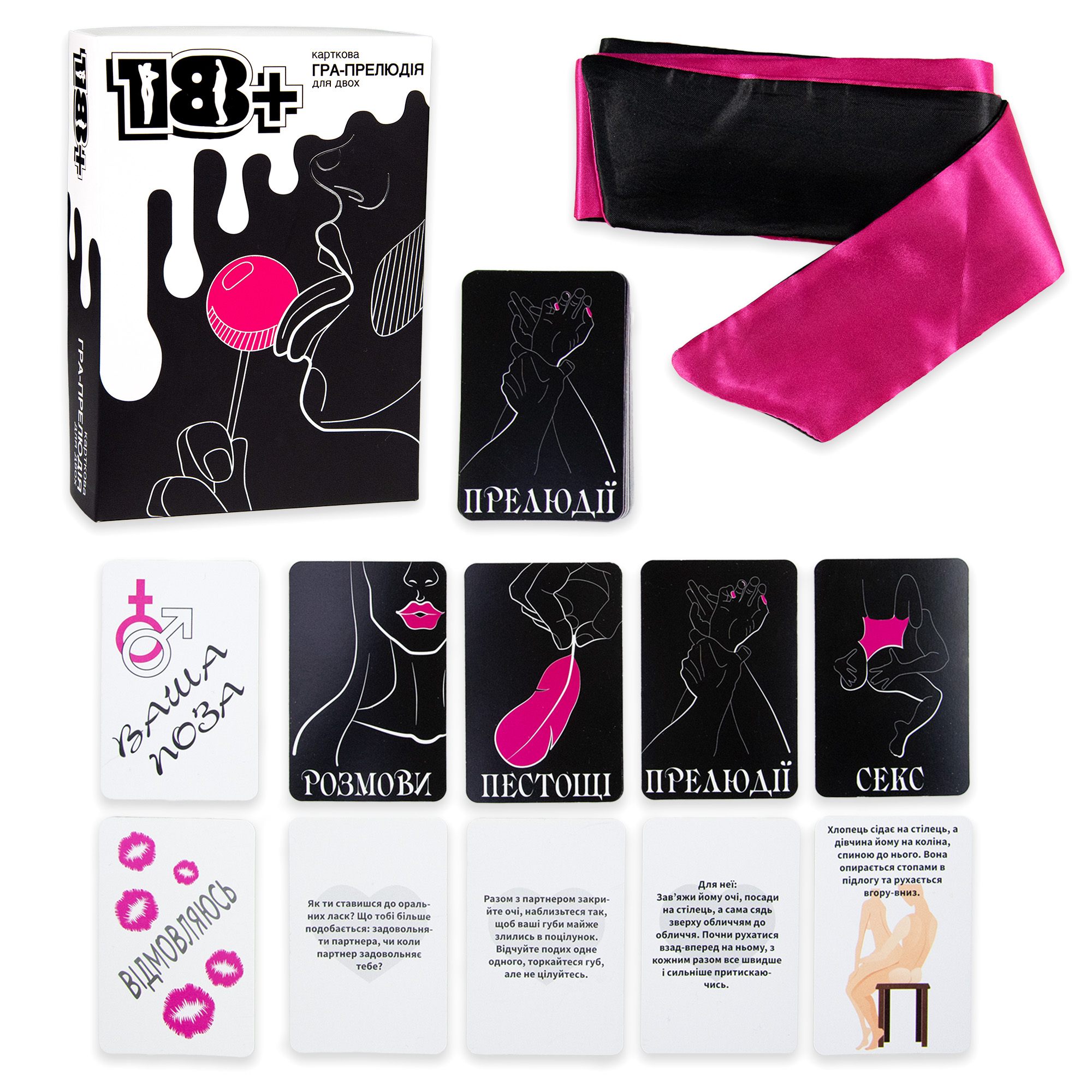 У ній 4 колоди карт: розмови, ласки, прелюдії та секс. Визначте, хто першим тягтиме карти. Потім беріть їх по черзі і відповідайте на запитання або виконуйте дії. У кожному колоді є картки "Відмовляюся". Якщо витягнули її – відкладайте убік і тягніть наступну, а цією карткою скористайтеся, щоб відмовитись від завдання. І не забудьте про пов'язку на очі з комплекту. З нею деякі завдання будуть у рази цікавішими.