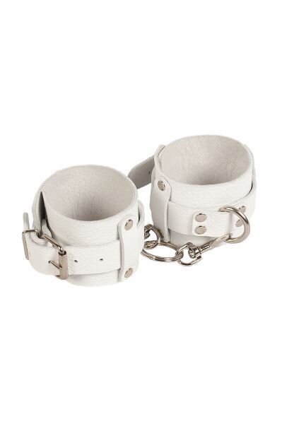 Шкіряні наручники білого кольору стануть ідеальним атрибутом для БДСМ ігор. Всередині м'які, не натирають. В якості застібки використана металева пряжка, яка допомагає надійно зафіксувати руки партнера, а за допомогою карабіна так само легко звільнити.