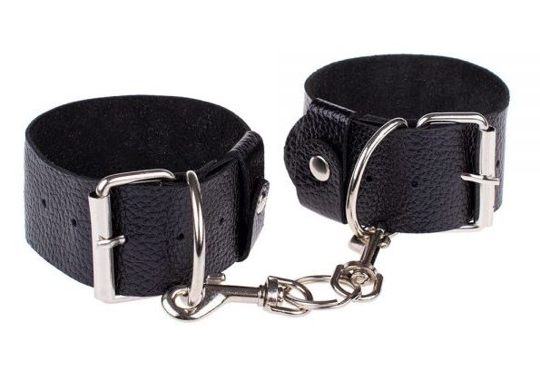 Кайдани на ноги чорного кольору зі шкіри вищої якості. Прикрашені заклепками з металу. Фіксуються наножники за допомогою пряжки, яка легко регулюється до потрібного розміру. Внутрішня підкладка виконана з м'якої шкіри спеціально для комфортного носіння. Стильний аксесуар для БДСМ ігор.