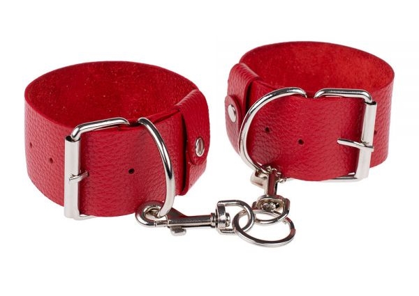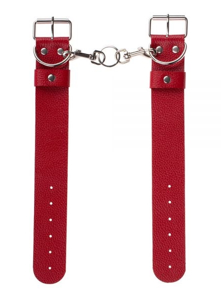 Кайдани на ноги червоного кольору зі шкіри вищої якості. Прикрашені заклепками з металу. Фіксуються наножники за допомогою пряжки, яка легко регулюється до потрібного розміру. Внутрішня підкладка виконана з м'якої шкіри спеціально для комфортного носіння. Стильний аксесуар для БДСМ ігор.