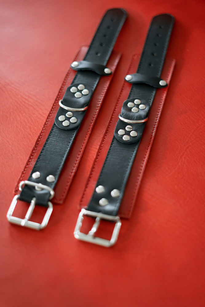 Окови із заклепками БДСМ із натуральної шкіри чорно червоного кольору Scappa