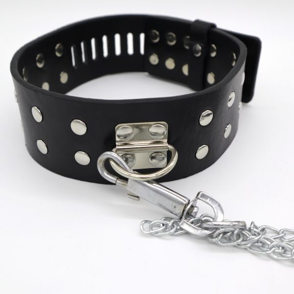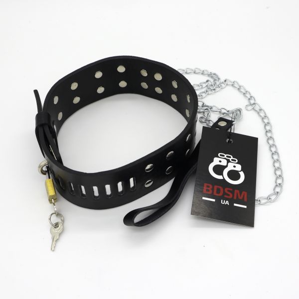 Дуже гарний чорний нашийник. Прикрашений двома рядами металевих паєток. Високоякісний матеріал. Регульований ремінь. Приєднана міцна металева ланцюг для приручення вашого партнера.