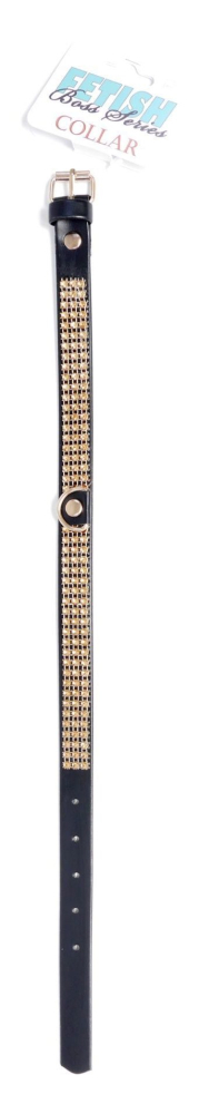 Ексклюзивний нашийник зі стразами золотого кольору, виконаний з міцної екологічної шкіри, ніжної на дотик, що робить його зручним у носінні.