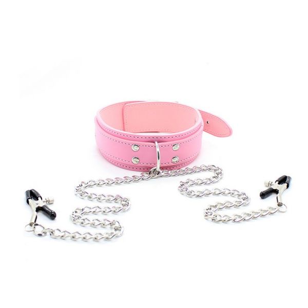 Нашийник Шкіряний рожевий з затискачами для сосків Bdsm4u